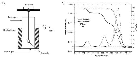 (a) Schematic representation of thermogravimetric analysis (TGA) instrument, (b) more complex overall degradation mechanism for poly(methyl methacrylate) (PMMA) made by free radical polymerization (FRP) as compared to PMMA made by anionic polymerization (AP); comparison of mass loss (here symbol W) for sample C (FRP) and sample H (AP) using TGA and differential thermal analysis (DTG) analysis; reproduced with the permission from ACS [28].