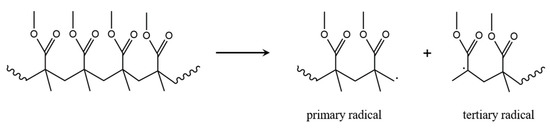 The main thermal initiation degradation reaction at high temperature is generally accepted to be random fission and thus defined based on the dominantly present H–T linkages as formed during PMMA synthesis (see Section 2) [29,71]. During such H–T fission, as shown in Figure 8, a primary and a tertiary macroradical are formed [72]. Note that AP-made PMMA only consists out of H–T linkages, and thus a single initiation mechanism is expected, consistent with the TGA/DTG profile in Figure 7b.