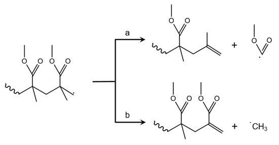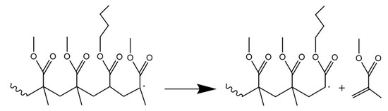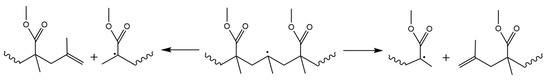 Several reports suggest that the primary radical, as formed during H–T fission, further decomposes via a side-group β-scission, as displayed in Figure 15a. The latter reaction leads the formation of an unsaturated PMMA species, which is thus prone to further degradation, but also addition. For completeness, it is mentioned here that Stoliarov et al. theoretically put forward that these primary radicals can also undergo the concerted reaction in Figure 15b [74].