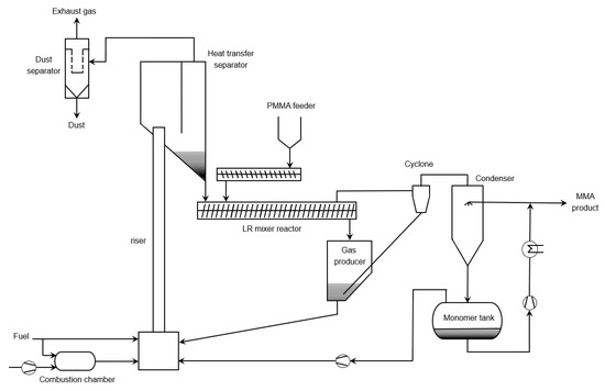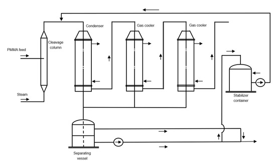 In this review, the interest goes to the thermal thus non-catalytic chemical recycling of poly(methyl methacrylate) (PMMA), an important vinyl polymer. Mechanical recycling of PMMA is less desired as the resulting product often does not lead to the desired optical properties. Kikuchi et al. reported that chemical recycling of PMMA can further reduce the environmental impact when mechanical recycling has limited potential [19]. In contrast to most other polymers, it is possible to quantitatively depolymerize pure PMMA towards the original monomer [20]. Already at the start of the large-scale industrial production of PMMA, cracking of PMMA towards MMA has been investigated. In these earlier processes, PMMA was mixed with sand or with super-heated steam to prevent uncontrolled pyrolysis and was performed in a batch wise process configuration. More recently, more economically feasible continuous processes were developed, in which use is made of an indirectly heated fluidized bed reactor environment [21,22,23].
