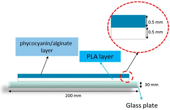 A PLA/phycocyanin–alginate composite patch was fabricated using a solvent casting method. Firstly, PLA beads and algae powder were oven-dried for 24 h at a temperature of 40 °C before use. PLA was then dissolved in chloroform for four hours. After the PLA was dissolved, the polymer solution was then poured onto a clean glass plate and left to dry for about three hours. Secondly, a mixture of phycocyanin and alginate powder (ratio 0.5:0.5) was mixed in 40 mL distilled water before being poured onto the PLA film on the glass plate. This PLA/phycocyanin–alginate film was then left to dry for 24 h. Figure 1 shows the schematic diagram of a PLA/phycocyanin–alginate composite, consisting of two layers.
