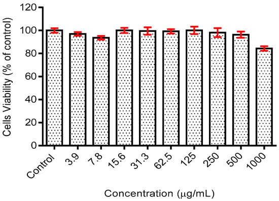 During preliminary study, a cytotoxicity test of the phycocyanin was conducted on the human fibroblast skin cell line, HSF1184, to verify and develop the toxicity profile of the compound on the healthy skin cell line. Within the tested concentration (3.9–1000 µg/mL), the extract exhibited minimal toxicity on the cell line with viability greater than 80% in comparison to the control group (untreated) for all doses tested (Figure 2). Moreover, the half maximal inhibition concentration (IC50) analysis using statistical software (GraphPad Prism V.6) resulted in an IC50 value of >1000 µg/mL, precisely at 2216 µg/mL. The low toxicity profile of the phycocyanin could be due to its protective potential. It was reported that treatment with phycocyanin at a low dose (0–250 µg/mL) had been shown to exhibit a protective effect against oxidative-induced cell death [16]. The presence of phycocyanin upregulated the expression of factors responsible for the growth of fibroblast-keratinocyte co-culture, including transforming growth factor (TGF)-α1 and interleukin (IL)-1β [17]. These findings, including those in the current study, showed that the phycocyanin-containing extract of spirulina is not toxic at dose <1000 µg/mL.