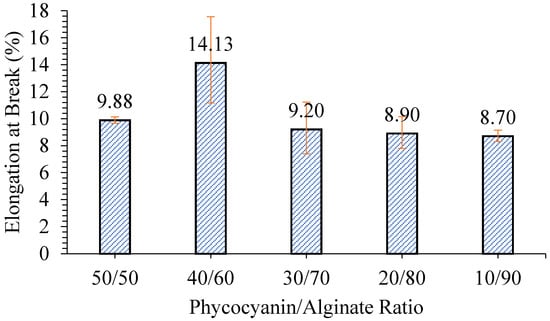 Elongation at break of patches with various phycocyanin/alginate ratios.