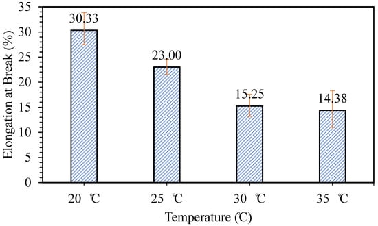 The final test was done to study the effect of mixing temperature on the flexibility and releasing properties of the patch formed. Figure 7 presents the effect of temperature on the elongation at break of the patch formed. It can be observed that the sample prepared at mixing temperature 20 °C has the highest elongation at break at 30%. However, as the mixing temperature increases, the elongation at break of the samples prepared decreases. De Morais et al. [21] stated that phycocyanin is stable at a lower temperature, and the stability decreases as the temperature increases, especially above 40 °C. This could be the reason why the elongation at break of the samples decreases as the temperature increases, as the instability of phycocyanin at a higher temperature may affect the mechanical properties of samples formed.