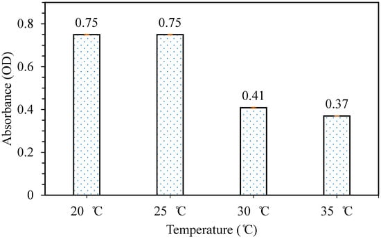 The releasing test was carried out to study the effect of stirring time on the releasing properties of patches formed. From Figure 6, it can be observed that the sample with phycocyanin/alginate mixture mixed for 20 h gave the highest releasing properties at 0.75. It can be assumed as previously explained for the flexibility test that, as the mixture of phycocyanin/alginate was mixed for an appropriate amount of time, the mixture became homogeneous, thus forming a patch with good properties. Based on the results obtained from the tensile test and releasing test, it was concluded that the best stirring time was at 20 h, as the patch produced had the best flexibility and releasing properties. The condition of a phycocyanin/alginate ratio of 40/60 that was stirred at 20 h was chosen for the next optimization study (mixing temperature).