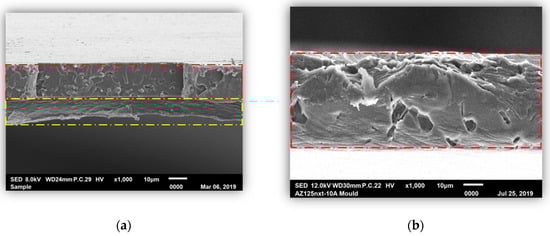 An SEM test was carried out in order to observe the morphological properties of the PLA/phycocyanin–alginate composite (sample selected from optimization study of preparation conditions), particularly for the sample before and after the releasing test. This was done to observe whether the active ingredient, phycocyanin, was released after the releasing test. Figure 9 shows SEM images taken of the sample before and after the releasing test. It can be identified that the upper layer (red dash line) was PLA, while the bottom layer (yellow dash line) was a phycocyanin/alginate layer. After the releasing test (Figure 9b), it can be observed that only one layer was observed, and it referred to the PLA layer. From this observation, we can assume that phycocyanin and alginate were released, as the second layer was not observed after the releasing test.