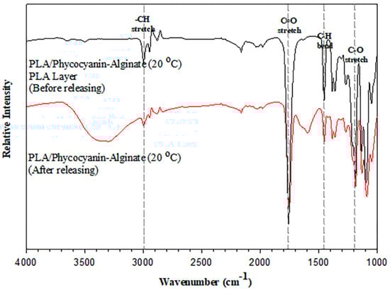 An ATR–FTIR test was conducted on the composite at optimized conditions, which were the PLA/phycocyanin–alginate composite prepared at a phycocyanin/alginate ratio of 40/60, stirred at 20 h and 20 °C. From Figure 10, it can be observed that there was no shift in absorption bands for the PLA/phycocyanin–alginate composite (20 °C) after the releasing test. Furthermore, this result was taken from the phycocyanin/alginate layer of the patch that had been released, and it can be seen that the characteristic of the absorption band was similar to the absorption band of the PLA layer of the composite before releasing. From this result, it can be assumed that phycocyanin and alginate had been fully released after the releasing test.