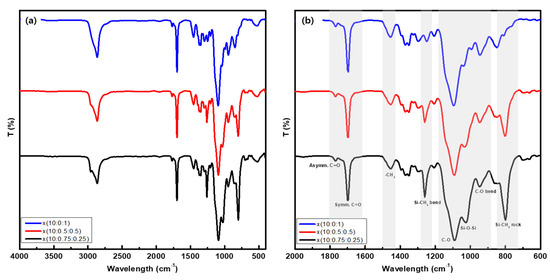 ATR-FTIR spectra of the x(PEG/PPG:PDMS:Ad) polymers with three different compositions for (a) 4000 cm−1–400 cm−1 and (b) 2000 cm−1–600 cm−1.