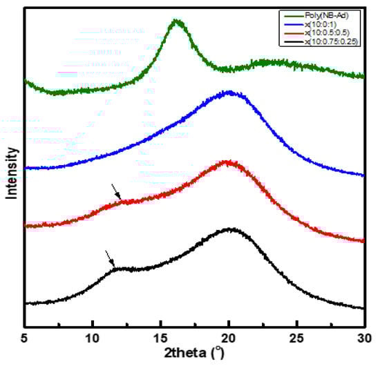 Meanwhile, for the poly(NB-Ad), a broad XRD peak was observed (Figure 4), while the peak was not clearly distinguishable for the x(PEG/PPG:PDMS:Ad) polymer membranes. This was possibly because the peak corresponding to the adamantane unit was masked (or overlapped) by the peak corresponding to the rubbery PEG, owing to its high content.