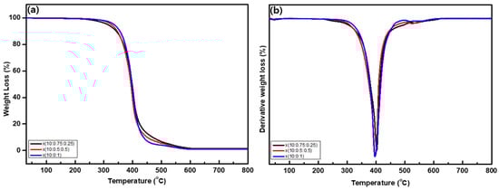 To further investigate the change in weight, which decreased with increasing temperature, the first differentiation curves were calculated (Figure 5b). The main component of the prepared x(PEG/PPG:PDMS:Ad) membranes is PEG/PPG, and it was found that the weight loss rate corresponding to its decomposition was large at about 400 °C. As mentioned above, when the PDMS content in the membrane was high, the weight loss rate was greater at a temperature lower than that of the x(10:0:1). Nevertheless, despite being present in all of the synthesized polymer membranes, adamantane was difficult to distinguish in the differential curve, owing to the overlapping of peaks corresponding to the decomposition of other precursors.