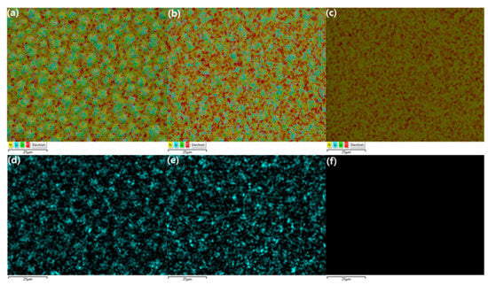 EDS elemental mapping images of x(PEG/PPG:PDMS:Ad) membranes (a,d) x(10:0.75:0.25); (b,e) x(10:0.5:0.5); and (c,f) x(10:0:1). Color index: C = red, N = yellow, O = green, Si = cyan.