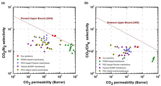 To compare the gas separation performance of the developed polymer membranes, the data points were plotted on a Robeson plot, and the data are compared with that for typical rubbery polymer-based membranes [11,13,21,26,30,31,41,42,43,44,45] (Figure 9). We found that our x(PEG/PPG:PDMS:Ad) membranes had both higher permeability and CO2/N2 selectivity than most PEG-based membranes, and a hybrid crosslinking membrane of PEG and silane, surpassing the 2008 Robeson upper bound for CO2/N2 (Figure 9a). Although our x(PEG/PPG:PDMS:Ad) membranes are mainly composed of PEG/PPG, and hence do not have higher permeability than the PDMS-based membranes, a higher selectivity was still observed for our membranes owing to their crosslinked structure.