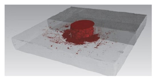 One disadvantage of the process is the fact that both sides of the joint must be accessible [16], which limits the use of the technique only to the part of the structures. However, this disadvantage is well recognized and quite common in joining techniques (appears, e.g., also in bolted joining). Another disadvantage is that it is impossible to disassembly the joint without destroying it. Also galvanic corrosion may occur in this joining method if rivets made of aluminium alloys or steel are used along with CFRP composite [22,23] due to the difference in the potential conductivity of the composite and the aforementioned metals [24,25]. Usually, the fasteners are required to be made of stainless steel or even titanium to minimize the corrosion [26]. However, the most serious and not fully recognized drawback of the technique seems to be the problem of process-induced damages in joining fibre-reinforced composite materials. From this point of view the SPR method is not appropriate for brittle materials [27,28,29]. Unlike most metals, composite materials rarely exhibit plastic behaviour. Therefore, as the punch energy cannot be utilized by plastic deformation, it may cause matrix and fibre damages, delaminations, and cracking in the composite material [26,29]. These damages may propagate when the joint is loaded under fatigue cyclic stresses and eventually cause premature joint failure by the composite rupture [21,30]. Moreover, the fibres are cut by the rivet, which causes the disruption of the load paths, as in the case of hole drilling. The mechanism causing delamination is also similar as in the case of drilling. As the rivet is punched through the subsequent plies, the thickness and the resulting stiffness of the intact plies is decreasing. Thus, the last plies are subjected to severe bending which may lead to a delamination if the peeling stress of the plies is exceeded [29]. Figure 2 shows delaminations around a punched hole in carbon fibre reinforced plastic revealed by a tomography scan [29].