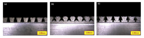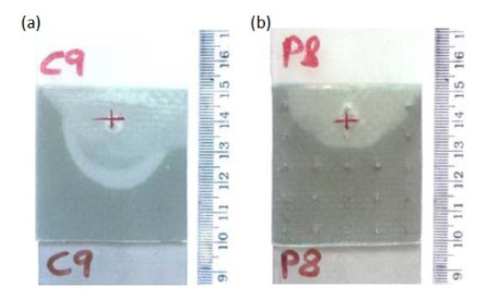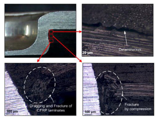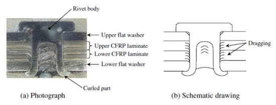 Ueda et al. found, on the basis of the cross-sections of SPR joined composite materials, that dragging of composite plies due to the punching appears around the hole (Figure 3) [21]. Delamination was not apparent on visual inspection because the delaminated plies were clamped together by the rivet [21].