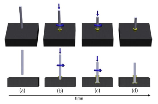 Friction riveting was first developed to create joints to metals in thermoplastic materials [33], but recently several works considered the use of this method for joining fibre reinforced polymer composites. Further use of this joining method may include a wide range of practical applications. So far, Blaga et al. proposed and evaluated the feasibility of using this method for the construction of composite emergency bridges [34,35]. Friction riveting consists in anchoring a metallic rivet inside a polymer or polymer composite base plate [36]. Firstly, a cylindrical rivet is placed in the spindle of the riveting equipment, and a plate made of thermoplastic polymer or thermoplastic matrix composite is fixed beneath it (Figure 4a). The process comprises of three steps: the friction step, the forging step, and the consolidation [37]. The rotating rivet is moved toward the plate (Figure 4b). When it touches the plate, the combination of rotation and axial pressure generates frictional heat, which melts the polymer around the rivet tip. The rivet is continuously fed through the plate. The heat generation rate during this phase increases, and the heat input grows to exceed the heat outflow due to the low thermal conductivity of the polymer [34,36]. Due to the local increase in temperature, the rivet tip becomes plasticised (Figure 4c) [36]. At this point, the rotation is decelerated and the rivet tip is suppressed by the additional axial pressure. This forming step widens the rivet tip, creating a mushroom-like shape. During the last step the joint consolidates and cools under the constant external pressure, while the rivet remains strongly anchored in the polymeric plate, forming a metallic-insert joint (Figure 4d) [36].