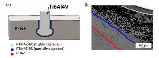 (a) Schematic drawing of the zones affected by heat and deformation, (b) microstructure of polymer heat affected zone PHAZ (red line) which includes: partially degraded polymer thermo-mechanically affected zone PTMAZ-PD (navy blue) and highly degraded polymer thermo-mechanically affected zone PTMAZ-HD (light blue) [41].