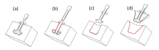 Friction riveting process steps: (a) positioning of the joined parts, (b) friction heat generates a molten layer of polymer and the rivet penetrates it, (c) increasing the axial force in order to widen and anchor river tip, (d) consolidation of the joint [36].