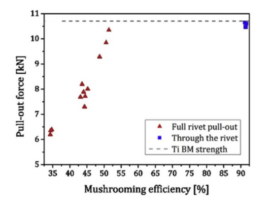 A mushrooming efficiency of 70% leads to the maximum performance of a metallic-insert joint [36]. At this threshold, the failure mode changes from failure mode pull-out of rivet (Figure 7c) to failure mode rivet failure (Figure 7a). The influence of the mushrooming efficiency on the pull-out force and the mode of failure is presented in Figure 8 [37].
