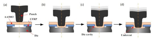 Clinching is a method of joining carbon fibre reinforced plastics (CFRP) and ductile materials [46]. This method was originally developed to join metal sheets including high strength steels and aluminium alloys [47]. It has been used in automotive [48]. Then, it has been extended to join many other materials including joining fibre reinforced composites to metal alloys [47]. Generally clinching consists in plasticising of either composite or metal sheet in order to build geometrical interlocking, however, it is preferable to place the material with higher ductility (metal) on the punch side, because during clinching the punch-side sheet undergoes severe plastic deformation [49]. The most common way to perform clinching of composite and metal consists in forcing the metal component into the composite component in order to produce mechanical interlocking (Figure 9). The composite component is placed on a die and covered with the metal component (Figure 9a). The punch is positioned over the die cavity and it forces the metal component into the cavity (Figure 9b). The composite component can have a predrilled hole necessary to assure interlocking as it is presented in Figure 9 [46,48,50] or the hole can be punched during the clinching process [47,49,51]. The pre-cutting of the hole reduces the material damages compared to punching the hole in composite [51], however, it also adds additional step to the joining process. The punch is forced further in order to push the metal sheet to fit the die (Figure 9c) in order to create interlocking joint with undercuts (Figure 9d) [46].