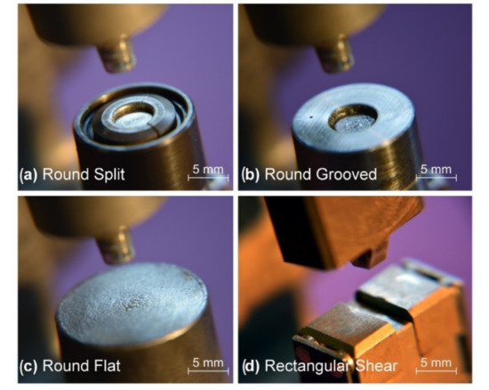Clinching dies: (a) round split; (b) round grooved; (c) round flat and (d) rectangular [49].