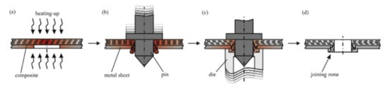 Apart from the conventional clinching process in which the metal component is plasticized in order to create lock in the hole made in the composite component, there have been several attempts made in order to design different processes, which can be incorporated to the group of ‘mechanical clinching’ methods. In those processes the composite component is the one which is softened to create a lock in the hole of the metal component. Only thermoplastic matrix composites are suitable to be joined by those processes, because the thermoset matrix, once cured, cannot be plasticized again and would crack under high strains required in clinching. Gude et al. developed a method called thermoclinching in order to join steel sheets with glass fabric reinforced polypropylene [53]. The composite was pre-cut in the joining zone and locally heated to increase its plastic deformation ability, shifted through the pre-punched metal sheet by a tapered pin and compressed from the backside by a die to generate a form-locked joint (Figure 12a–c). After cooling and solidification, the mould was opened to reveal the geometrical joint (Figure 12d) [53].
