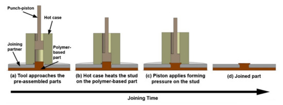 The joints were tested in single lap shear experiments and failed by either pull out (3kN) or shear (2 kN) of the composite formed lock, depending on its geometrical features [53]. Abibe et al. proposed a joining method called injection clinching joining (ICJ) [56,57]. This method starts when a composite part with a protruding stud is pre-assembled with a joining partner that contains a hole, so that the stud fits in the hole. The hot case and punch-piston tool system approaches the pre-assembled parts, with the hot case containing the polymeric stud (Figure 13a) [56]. The stud is heated at a certain processing temperature for a predetermined joining time (Figure 13b), after which the punch-piston pushes the softened polymer into the hole (Figure 13c) [56]. Then, the system is cooled under pressure to reduce the polymer thermal relaxation and the joint is consolidated (Figure 13d). By the end of the process, a joint with no additional parts other than the joining partners and with the polymeric stud working as a rivet to the joint is obtained [56].