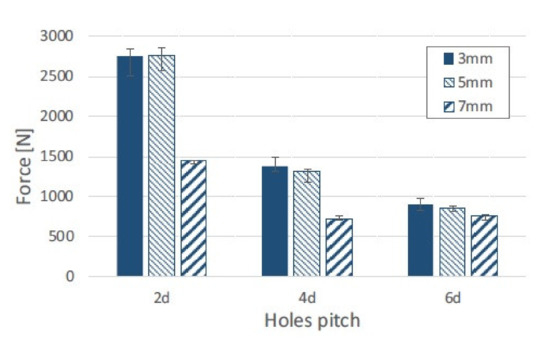 Strength of specimens with different hole diameters (3 mm, 5 mm and 7 mm) and different pitches between the holes (2d, 4d and 6d) [58].