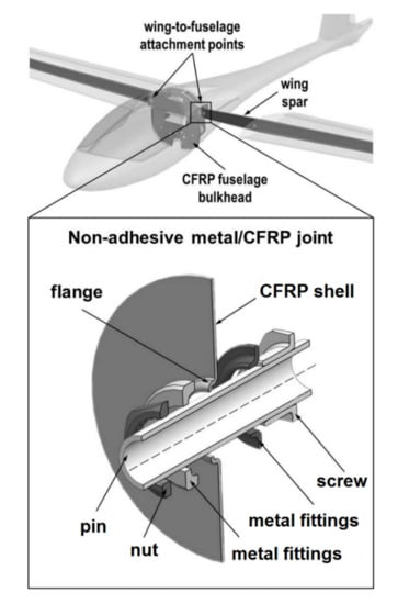 Fibre reinforced composite materials continue to gain progressively larger share in the structures of modern aircraft. The amounts of composite laminates used in the Boeing 787 Dreamliner and Airbus A350 exceed 50% of the vehicle weight [1,2]. Since the metal elements are and will be indispensable in aerospace structures, the problem of joining composite and metal elements becomes more and more important as the share of composite elements in the structures increases. The joint used in a composite structure is usually the weakest point of the structure, and thus determines the structural efficiency [3]. A separate part of this literature review is devoted to the bolted joining of composite and metal elements [4], as it is the most widely used method of mechanical joining. However, the bolted joining of composite materials has several drawbacks, resulting mainly from the need of drilling holes. The process of drilling disrupts the continuity of the fibres reducing the load carrying capacity [5,6,7] and causes damages (such as delamination, fibre pull-out and microbuckling [7]). Therefore, the other methods of mechanical joining have been developed and some of them were specially dedicated for joining composite to metals. Those methods include self-piercing riveting, friction riveting, clinching, non-adhesive form-locked joints, pin joints, and loop joints. Some of those methods do not require making holes in cured composite material (non-adhesive form-locked joints, pin joints and loop joints) and thus eliminate the disruption of the fibre continuity and drilling-induced damages, whereas, the others as riveting and clinching disrupt the structure of the composite significantly. Some of the presented methods, including non-adhesive form-locked joints, pin joints, and loop joints, take the advantage of the fibrous nature of the composites in order to transfer loads onto the metal structure in a sophisticated yet clever way. Some of the methods, as self-piercing riveting or form-locked joints, have been successfully developed and employed in commercial applications, whereas, the others, like pin and loop joints, are merely ideas, tested only at the specimen level. Some of the methods present the possibility of joint disassembly without destroying it, whereas some are permanent. Some methods can be used to join any composite and some of them are limited only to the composites with thermoplastic matrix.