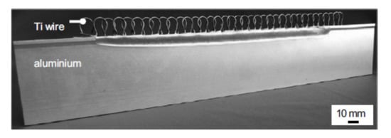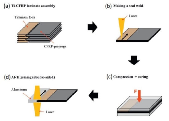 - Woizeschke, P.; Schumacher, J. Failure behaviour of aluminium-titanium hybrid seams with a novel aluminium-CFRP joining concept. Phys. Procedia 2013, 41, 12–19. [Google Scholar] [CrossRef]
