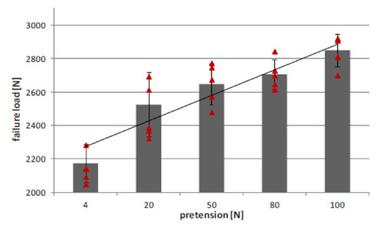 Metal/composite specimens joined by friction riveting were also tested in tensile single lap shear test [41]. The highest strength (6.7 ± 1.6 kN) was obtained for intermediate riveting conditions (rotational speed 900 rpm and friction time 1.2 s), while for higher rotational speed (rotational speed 1000 rpm and friction time 1.2 s), the mechanical performance (5.3 ± 1.3 kN) was probably negatively influenced by excessive polymer degradation, leading to a decrease of about 28% of the ultimate lap shear force [41]. Specimens failed mainly by two combinations of failure modes. The strongest joints for each set of investigated conditions failed by the combination of bearing in the composite and metallic plates and shear through the metallic rivet, whereas, the others failed by the combination of bearing and pull-out of the rivet [41]. Blaga et al. investigated the friction riveting of polyetherimide glass fibre reinforced laminates [34,35]. The titanium rivets with a 5-mm diameter were used [34]. The influence of the rotational speed on the joint formation and mechanical performance was evaluated under the joining conditions: constant joining time (3.2 s), constant joining pressure (1.0 MPa) and varying rotational speeds of: 8000 rpm (Specimen A1), 9000 rpm (Specimen A2) and 10,000 rpm (Specimen A3) [34]. The joints were then tested in pull-out tests. Figure 6 shows the ultimate tensile forces for each specimen riveted with a different rotational speed. The highest strength was achieved for 10,000 rpm speed. The anchoring efficiency of the rivet can be estimated through the volumetric ratio (VR), which takes into account the ratio of the volume of dislocated polymeric material, the volume of the deformed metallic rivet and the volume of the remaining polymeric material over the deformed shape of the rivet [34]. The strength was related to the volumetric ratio, leading to the conclusion that a higher rotational speed causes a higher volumetric ratio, which in turn increases the pull-out strength.
