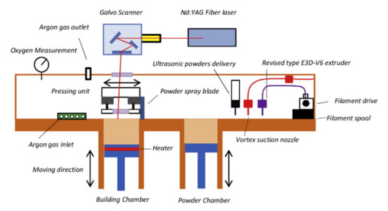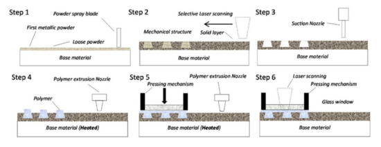 - Chueh, Y.-H.; Wei, C.; Zhang, X.; Li, L. Integrated laser-based powder bed fusion and fused filament fabrication for three-dimensional printing of hybrid metal/polymer objects. Addit. Manuf. 2020, 31, 100928. [Google Scholar] [CrossRef]