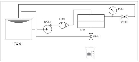 The membrane system was designed to work with or without recirculation of permeate and retentate to the feed tank (TQ-01). The system consisted of a pump (BB-01) that transfers the solution from the feed tank to the permeation cell (C-01) with a flowrate meter (FI-01) between them. The permeate stream could be collected or recirculated by switching the valve (VE-01), and the retentate stream was continuously recirculated. The system’s pressure was measured by a control pressure gauge (PI-01) and adjusted through a valve (VG-01).