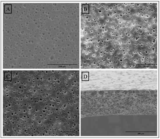 Field emission scanning electron microscopy (FESEM) photomicrographs of the surfaces (1000×) of (A) MF-membrane, (B) MF-15mA-15s, (C) MF-50mA-120s, and of (D) cross section of MF membrane (500×).