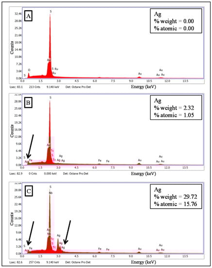 The EDS spectra of the membranes’ surface are portrayed in Figure 3, where the presence of silver element is indicated by black arrows. In addition, Figure 4 shows their EDS mapping and FESEM images. FESEM images exhibit spherical particles on the surfaces of MF-15mA-15s (C) and MF-50mA-120s (D). These spherical particles present average diameters of 88 and 50 nm for MF-15mA-15s and MF-50mA-120s, respectively. The EDS mapping revealed uniform distribution of silver element and, as expected, a larger amount of AgNps in MF-50mA-120s, corroborating what was observed in FESEM images. These results suggest that the increases in sputtering time and sputtering current reduce the diameter of silver particles, which might be related to a higher nucleation rate for nanoparticle growth at higher sputtering current, and confirm that the silver nanoparticles were successfully impregnated on the surface of the MF membranes.