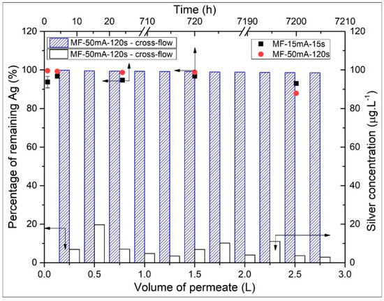 In addition, a test with recirculation of both permeate and retentate streams (full-recycle setup) was also performed during 24 h. The concentration of silver leached (in the feed tank) was 8.4 µg L−1 at the end of the experiment, which indicates that 98.8% of the initial silver impregnated on MF-50mA-120s remained on its surface after permeation. The water permeation test corroborates the silver loss after 24 h of immersion in the water bath and indicates that, even at a flowrate of 40 L h−1, the MF-50mA-120s membrane showed a small loss of silver. The results of silver leaching in both experiments indicate that the sputtering technique is effective for impregnating and entrapping silver nanoparticles on the surface of membranes. This finding is important for the maintenance of the membrane’s biocidal performance and for the minimization of silver leaching to the environment.