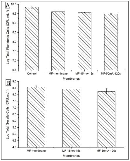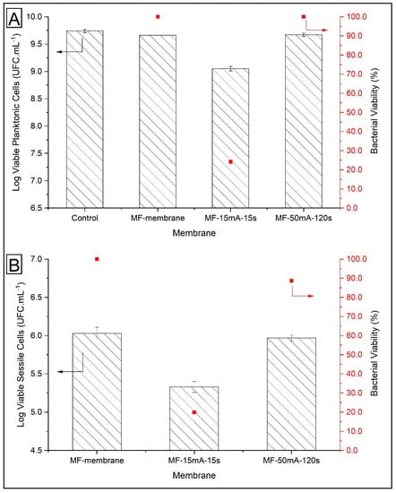 Figure 9 also depicts the viable sessile cells on the different membranes. A comparison between MF membrane and MF-15mA-15s indicates that the bacterial growth showed a 0.7 log unit reduction in CFU mL−1, while the viability of the sessile cells was 19.8% after 24 h of exposure to AgNps. This result confirmed that the silver impregnated in MF-15mA-15s improved the bactericidal properties of the membranes, which is in agreement with other studies that investigated silver nanoparticles synthesized by chemical route [,].