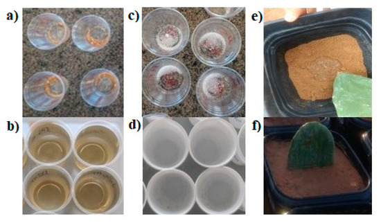 (a) Test hydrogel (TH); (b) TH hydrated; (c): commercial hydrogel (CH); (d) CH hydrated; (e) application of hydrogels to the soil before planting; (f) cactus pear planted with hydrogels.