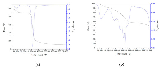 The thermogravimetric curve and the thermogravimetric derivative (Figure 2a) of the babassu coconut mesocarp indicates that the thermal decomposition of this material occurs in two stages, the first in the range of 35 to 150 °C, with a 10% weight loss, which is related to the dehydration of the material (vaporization of physically adsorbed water) [25,26].