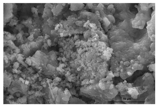 The micrograph of the lyophilized hydrogel of the mesocarp reticulated with acrylamide with fertilizer added is presented in Figure 3. After the crosslinking a change occurred, as the babassu mesocarp has a spherical shape, very similar to starch microscopy [28] and after modification, a heterogeneity in the size of the particles was caused by the crosslinking, followed by the absorption and lyophilization of the water. A similar result was observed in thermogravimetry with several mass events in very close regions, caused by different particle sizes, altering its stability, which is ideal for application in systems to control release of water and fertilizers on the soil. Its microstructure contains pores distributed by its extension, which greatly help in the process of water absorption by the material, with very varied porosities, caused by the size of the particles, generating an excellent benefit for the controlled release [29]. The smallest particles found in the image are the fertilizer added to the system.