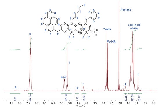 1H-NMR (500 MHz, CD3COCD3, δ ppm): 1.15 (m, 3nH, CH3), 1.23 (m, 3nH, CH3), 4.5 (s, 2H, Pyrene–CH2), 5.14 (m, 2nH, CH2), 5.3 (m, 1nH, CH), 7.35 (m, 5nH, C6H5), 7.98–8.34 (m, 9H, pyrene); MNMR = 7000 g/mol, n = 30.