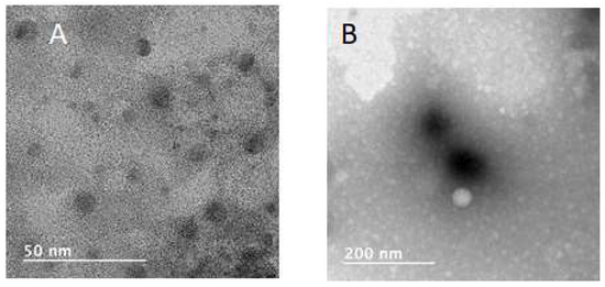 TEM images of (A) PdiMeMLABn30, and (B) PdiMeMLAHe30 based NPs.