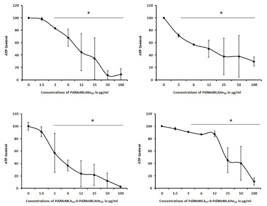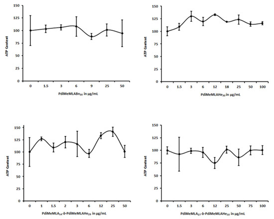 In progenitor HepaRG cells (Figure 5), the ATP content decreased in a dose-dependent manner for both the hydrophobic homopolymers and block copolymer PdiMeMLA-b-PdiMeMLAHe derived NPs. For the homopolymer-based NPs, the IC50 values (Table 7) revealed that PdiMeMLAHe30 based NPs are the least toxic one with an IC50 of 23.56 ± 2.12 µg/mL, while the IC50 of PdiMeMLABn30 based NPs was much lower at 6.95 ± 2.2 µg/mL. These data suggested that the nature of lateral groups of the hydrophobic homopolymers derivated from PdiMeMLA has a significant effect on the cytotoxicity of the corresponding NPs towards progenitor HepaRG cells. For PdiMeMLA27-b-PdiMeMLAHe50 NPs and PdiMeMLA54-b-PdiMeMLAHe29 NPs, the IC50 found were 22.11 ± 0.84 and 4.65 ± 0.49 µg/mL, respectively, demonstrating that the PdiMeMLA54-b-PdiMeMLAHe29-based NPs were much more toxic and that hydrophilic/hydrophobic molar mass ratio of block copolymer PdiMeMLA-b-PdiMeMLAHe strongly impacted the cell viability of progenitor HepaRG cells. The PdiMeMLA27-b-PdiMeMLAHe50 NPs were the least toxic since no significant decrease in the ATP content was observed up to 12 µg/mL.