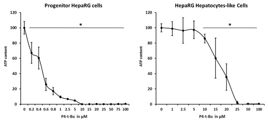 Progenitor and differentiated HepaRG cell viability evaluated by measuring the ATP content at 24 h of incubation with increasing concentrations of P4-t-Bu. Statistics: * p < 0.05 for treated cultures versus untreated control cultures (0).