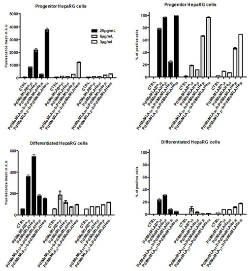 We next evaluated the cell uptake of homopolymer- and amphiphilic block copolymer-based NPs in both progenitor and differentiated HepaRG cells (Figure 8). Because of the significant cytotoxicity of some NPs towards progenitor HepaRG cells, we selected three concentrations (3, 6 and 25 μg/mL) of DiR-loaded NPs to assess their cell internalisation. After incubation of cells with NPs for 24, the viable cells were analysed by flow cytometry and two parameters were measured, the percentage of cells that had internalized fluorescent NPs (positive cells) and the mean of fluorescence reflecting the levels of NP accumulation in positive cells (Figure 8).