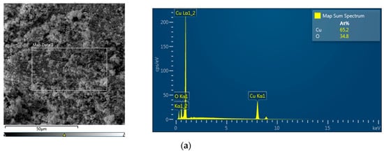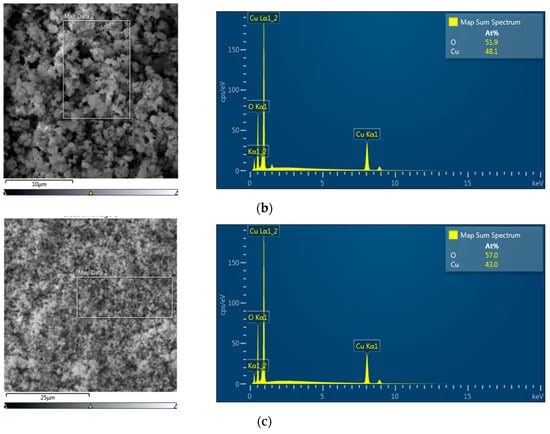 The surfaces of the composites were analyzed by EDS. The left panels of Figure 2 show the coating of NPs on the polymeric surface. The right panels show the molar fractions of copper and oxygen atoms. For composites containing CuNPs and Cu2ONPs (Figure 2a,b, respectively), the atomic fraction of oxygen was higher than expected, probably due to partial oxidation of copper and cuprous oxide NPs under ambient conditions. The same phenomenon was observed in our previous work [27]. However, the copper-oxygen molar ratio in immobilized CuONPs was close to 1:1, as anticipated (Figure 2c).