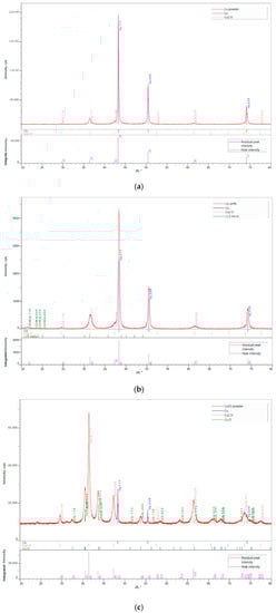 The phase composition of the powder and immobilized CuNPs, Cu2ONPs, and CuO were studied by XRD analysis using a Rigaku SmartLab SE X-ray powder diffractometer with Cu Kα radiation (λ = 0.154 nm) for phase identification. Full pattern identification was made by the SmartLab Studio II software package, version 4.2.44.0 (Rigaku Corporation, Tokio, Japan). Materials identification and analysis were performed by the ICDD base PDF-2 Release 2019 (Powder Diffraction File, ver. 2.1901). XRD patterns were received at 40 kV and 40 mA. For the powder samples the diffractograms were obtained with Bragg–Brentano geometry. The XRD patterns were recorded in the 2Θ range of 20–80° with a step size 0.01° and speed of 4°/min. For immobilized NPs the grazing incidence geometry with an incident angle of 0.5° was applied. The XRD patterns were recorded in the 2Θ range of 20–80° with a step size 0.01° and speed of 0.5°/min.