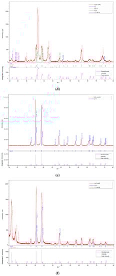 X-ray Diffraction (XRD) analysis of (a) CuNPs; (b) LLDPE/CuNPs; (c) Cu2ONPs; (d) LLDPE/Cu2ONPs; (e) CuONPs; (f) LLDPE/CuONPs.