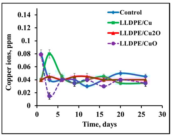 Leaching of copper ions into saline from composites of LLDPE and NPs of copper and copper oxides. Control—saline solution.