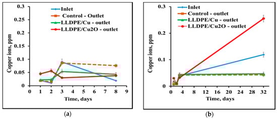 Leaching of copper ions from composites of LLDPE and NPs of copper and copper oxide into bacterial suspensions of (a) S. aureus and (b) E. coli in saline in a continuous experiment. Copper concentration was measured at the inlet to the system and at the outlets from the columns with composites LLDPE/CuNPs and LLDPE/Cu2ONPs, and from a control column not containing composites.