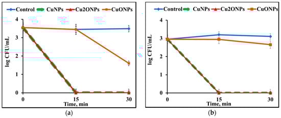 First, the free NPs were tested for antimicrobial activity in batch regime experiments against S. aureus and E. coli. It can be seen that free CuNPs and Cu2ONPs eradicated both S. aureus (Figure 6a) and E. coli (Figure 6b) after 15 min. CuONPs decreased the concentration of S. aureus cells by only 2 log10 after 30 min, and the concentration of E. coli cells was not reduced significantly even after 30 min. The difference in the antibacterial activity of LLDPE/CuONPs and LLDPE/Cu2ONPs may be associated with different oxidation states of copper in these composites. Meghana et al. assumed that enhanced antibacterial activity of Cu2O can be explained by its rapid binding to cell proteins, causing direct damage to the enzyme fumarase A, when this process takes place much faster than in the case of CuO [26].
